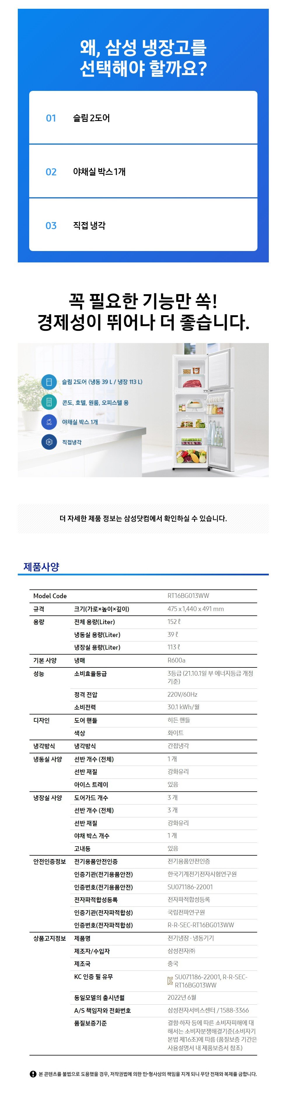 [삼성전자] 삼성 냉장고 134L RT16BG013WW