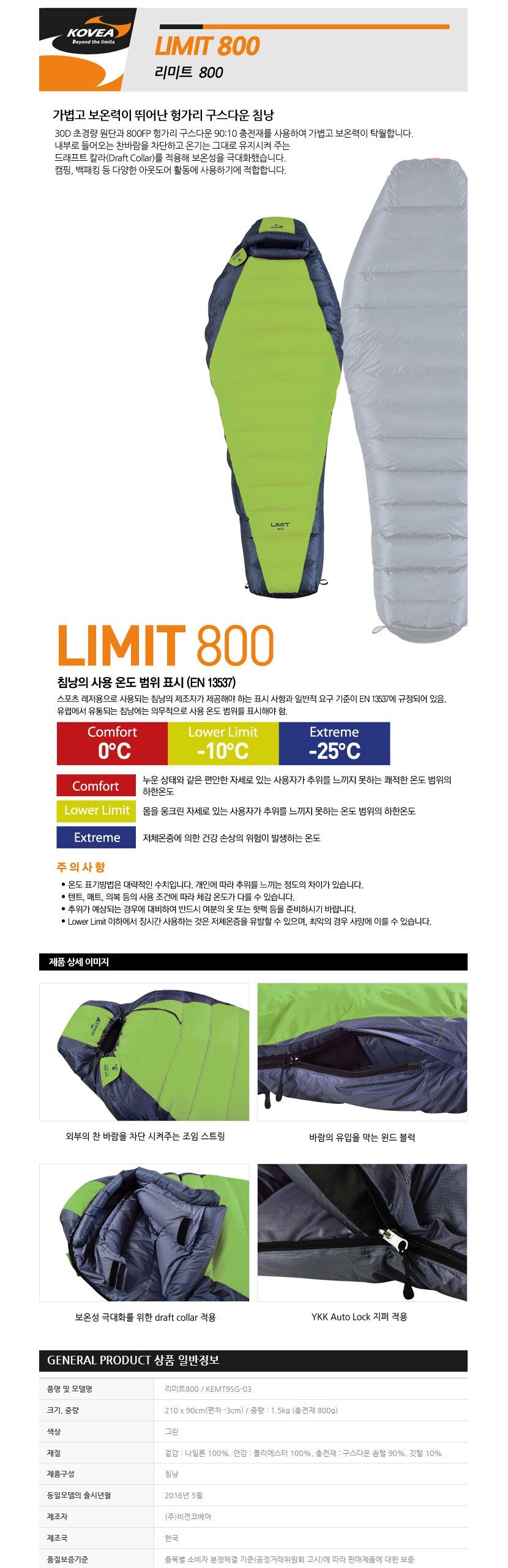 [코베아] 리미트 800 (KEMT9SG-03) - 초경량/구스다운침낭