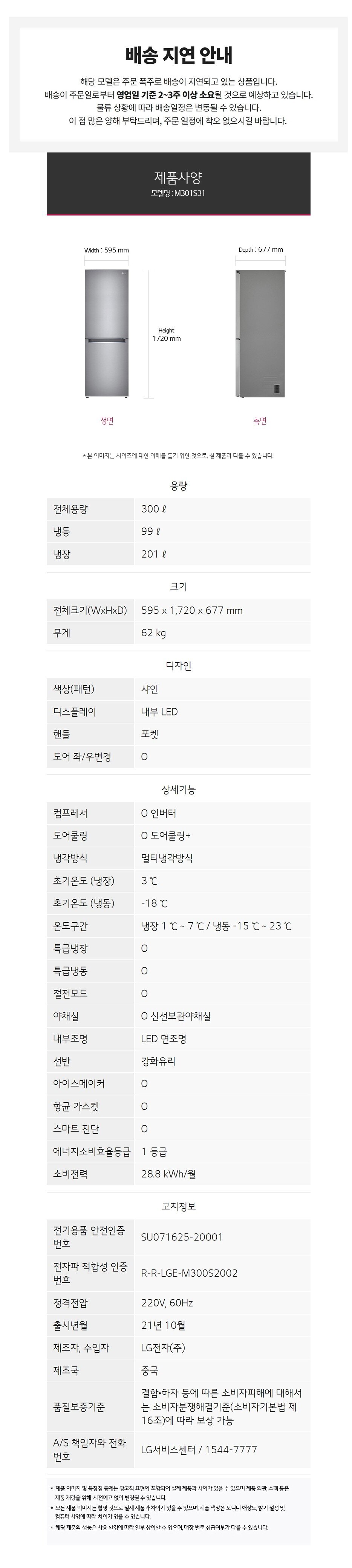 [LG전자] 일반냉장고 2도어 상냉장 300L [샤인/M301S31]