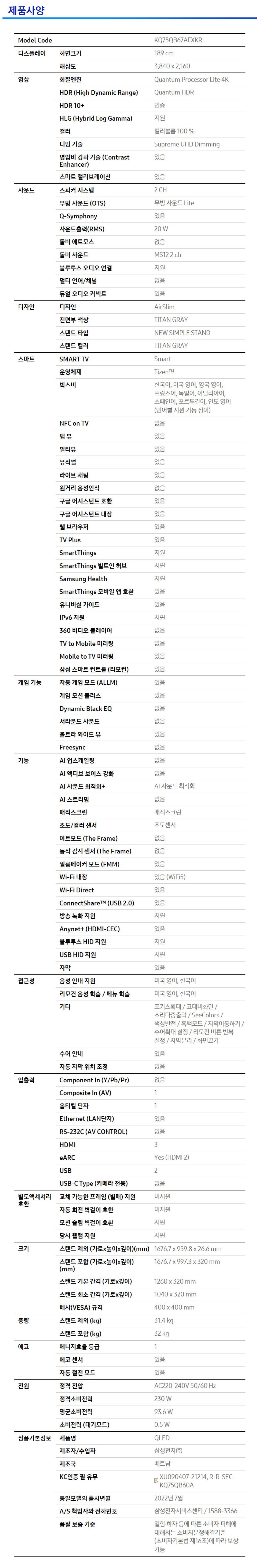 [삼성전자] QLED 4K KQ75QB42AFXKR 75인치 (189cm) [벽걸이형][삼성 공식인증점][전국무료 배송/설치]