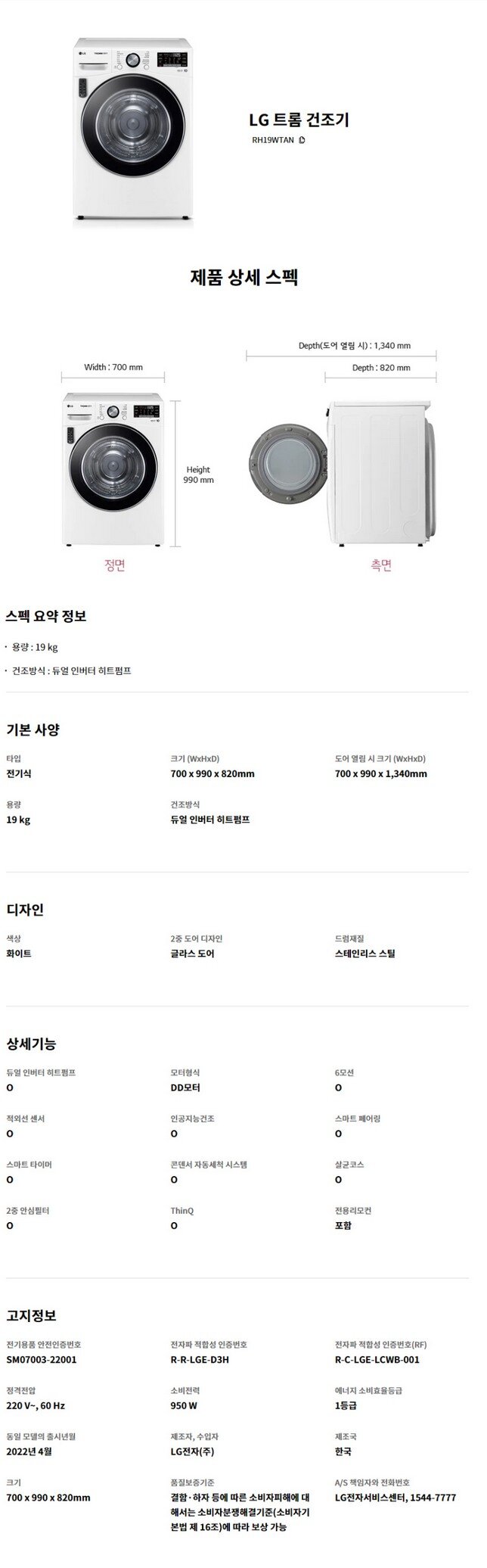 [LG전자] B2B TROMM(트롬) 의류건조기 19kg [화이트/RH19WTAN]