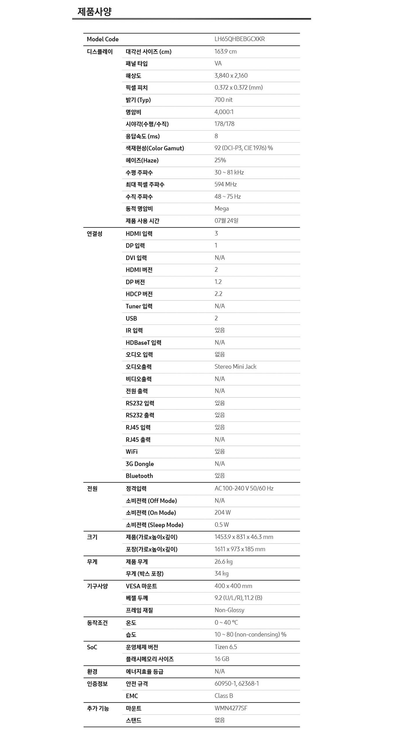 [삼성전자] 4K UHD 65인치 사이니지 TV 모니터 LH65QHBEBGCXKR + 웰컴보드