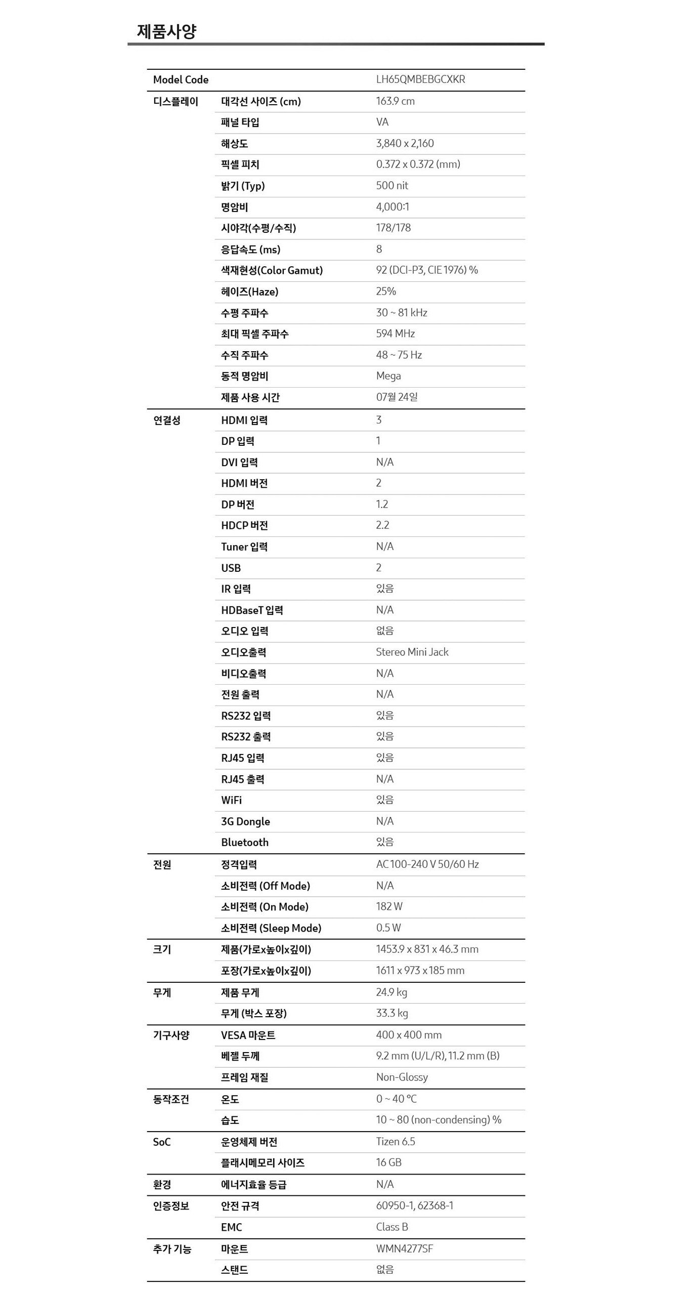 [삼성전자] 4K UHD 65인치 사이니지 TV 모니터 LH65QMBEBGCXKR 세로 벽걸이형