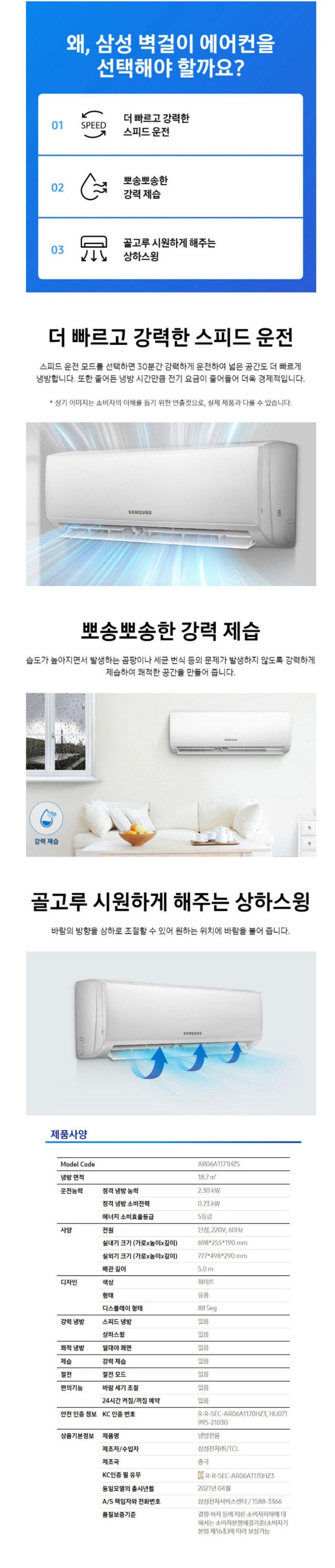 [삼성전자/AR06A1171HZS] 23년형 벽걸이에어컨 06형 5등급 전국배송 기본설치비포함