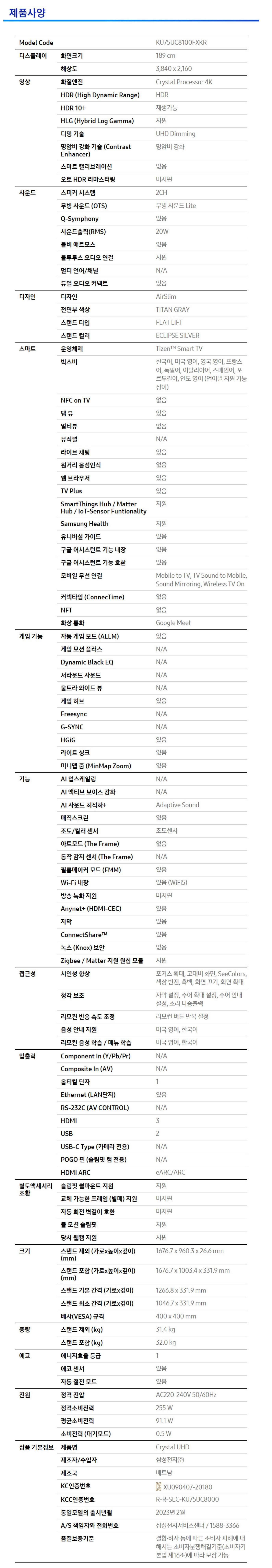 [삼성전자] 삼성 Crystal UHD TV 슬림핏 벽걸이형 KU75UC8100-W [삼성 공식인증점][전국무료 배송/설치/폐가전 회수]