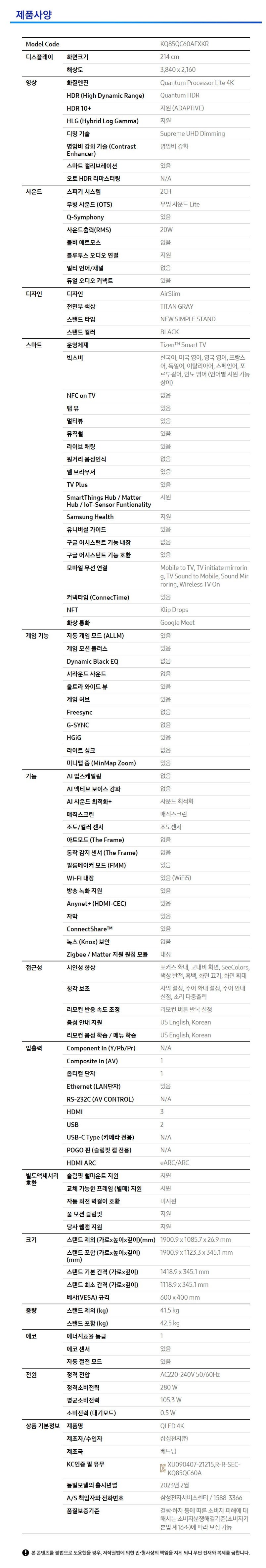 삼성전자 2023 NEW 최신상 삼성 QLED TV 85인치 KQ85QC60AFXKR