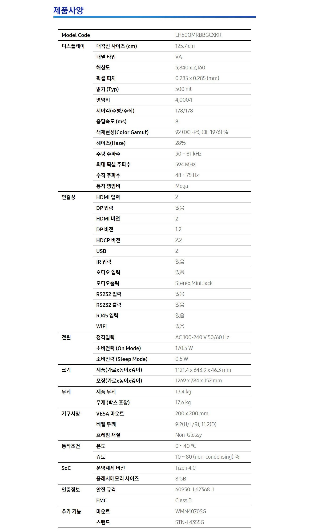[삼성전자] 4K UHD 51인치 사이니지 IPTV 모니터 LH51QMRBBGCXKR 본체