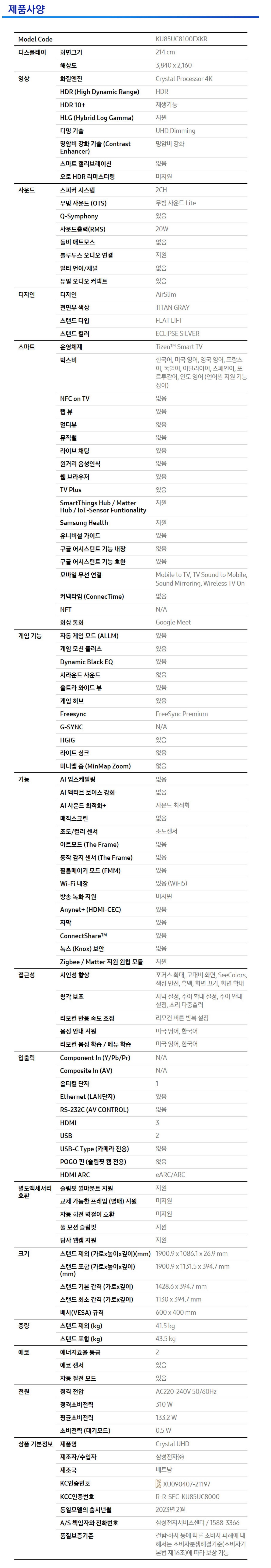 [삼성전자] 삼성 Crystal UHD TV 슬림핏 벽걸이형 KU85UC8100-W [삼성 공식인증점][전국무료 배송/설치/폐가전 회수]