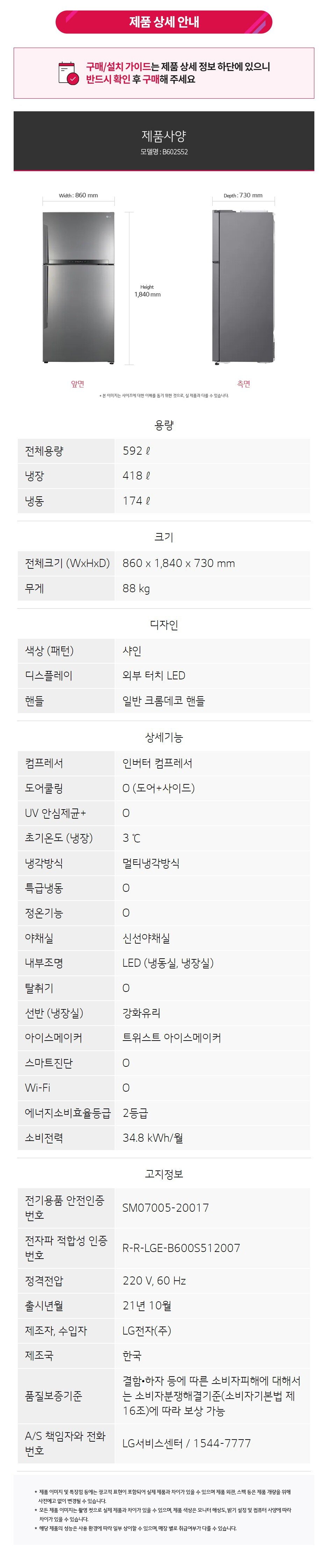 [LG전자] 일반냉장고 2도어 592L [샤인/B602S34]