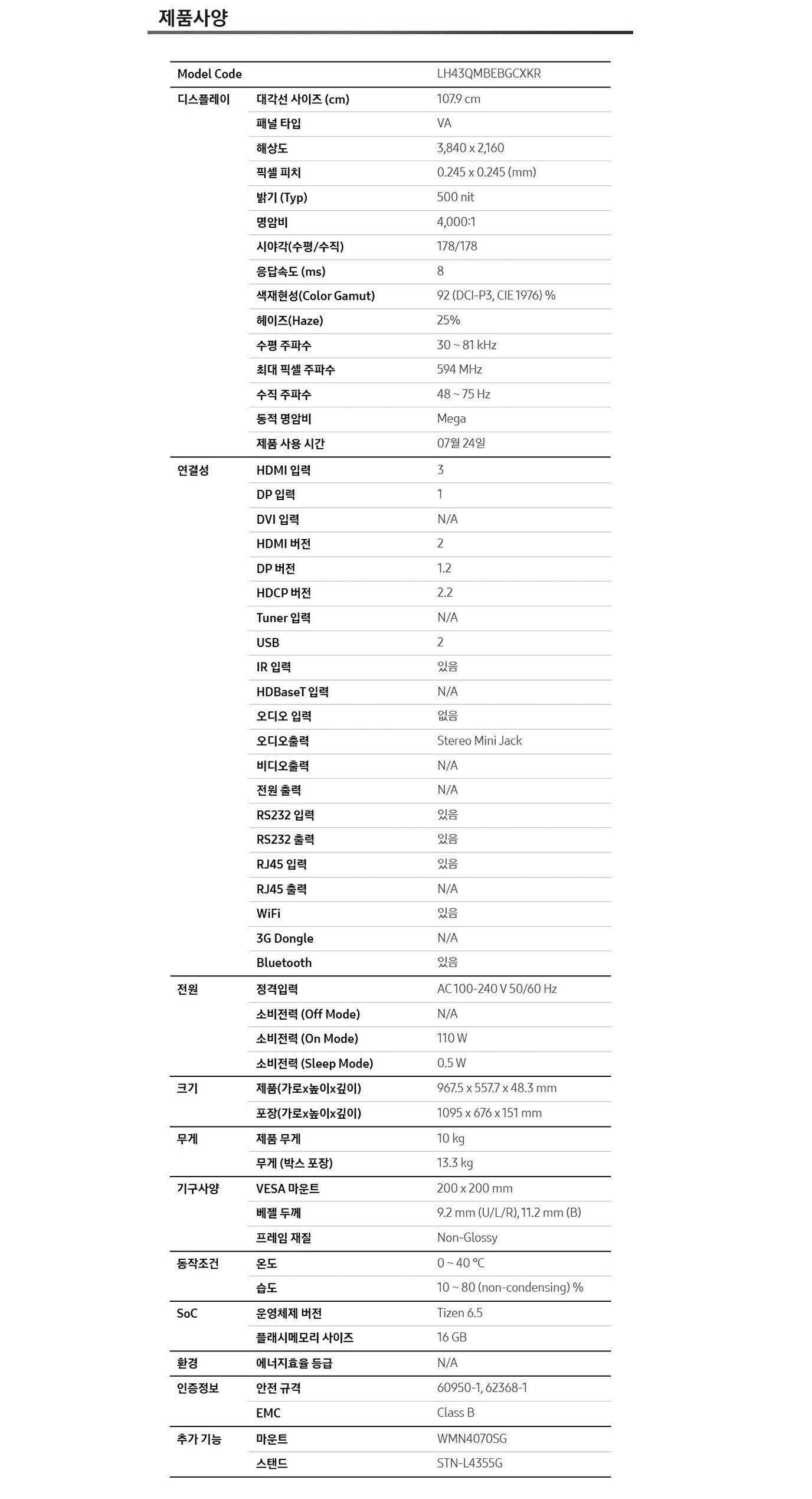 [삼성전자] 4K UHD 51인치 사이니지 IPTV 모니터 LH51QMRBBGCXKR 벽걸이형