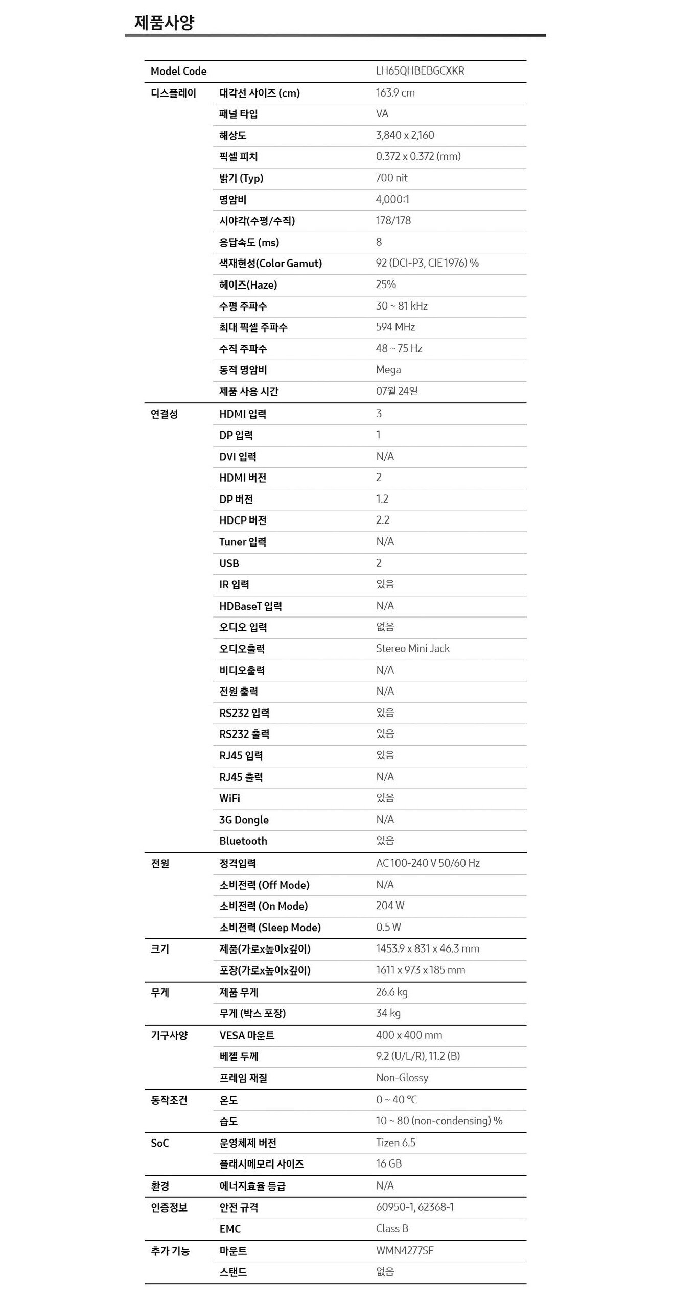 [삼성전자] 4K UHD 65인치 사이니지 TV 모니터 LH65QHBEBGCXKR 본체