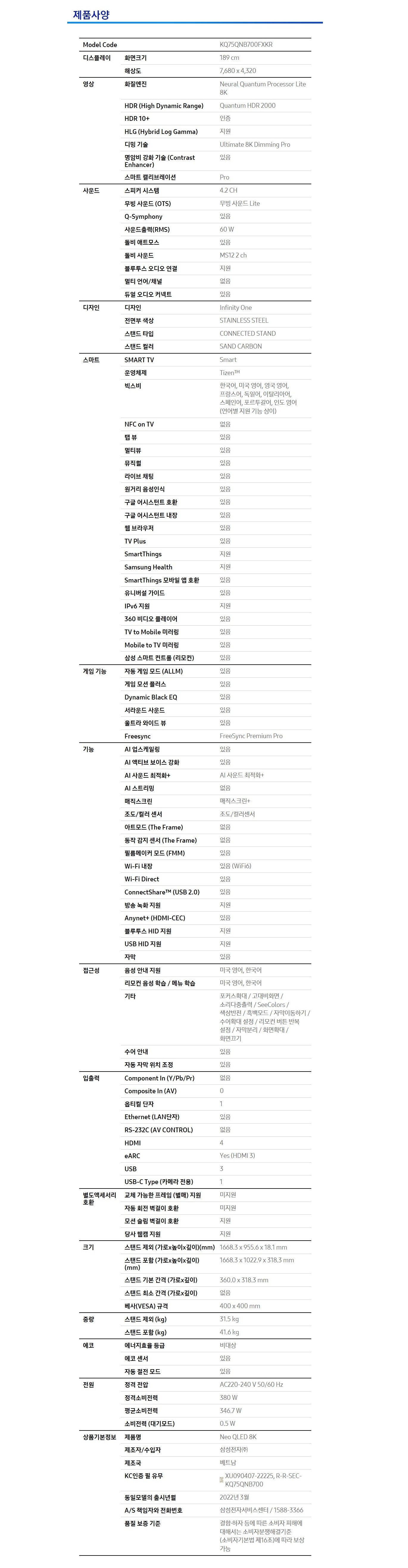 [삼성전자] 삼성 Neo QLED 8K TV KQ75QNB700FXKR 189cm 조절벽걸이