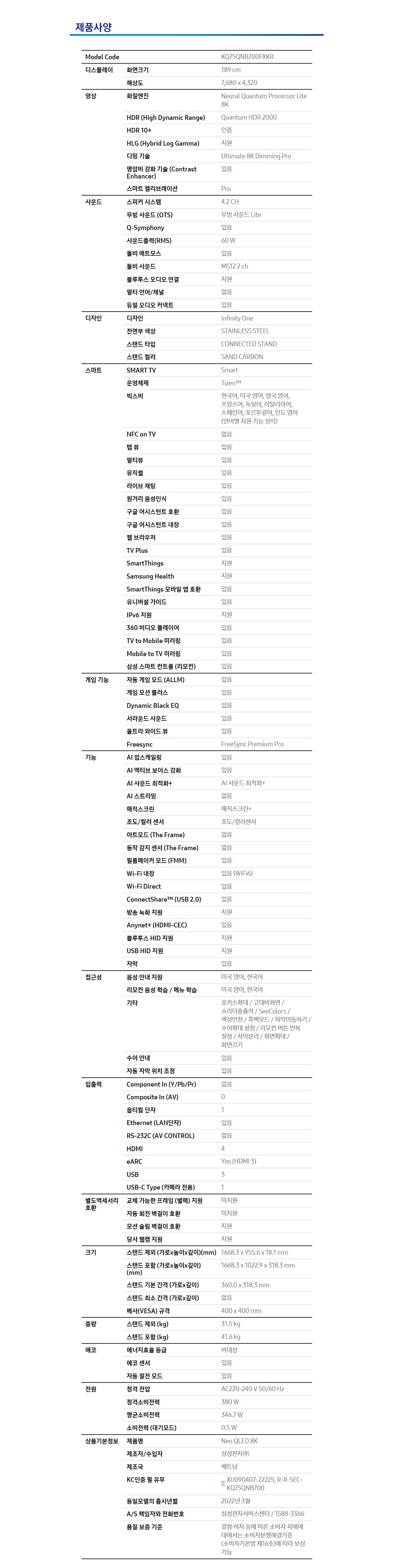 [삼성전자] 삼성 Neo QLED 8K TV KQ75QNB700FXKR 189cm 스탠드