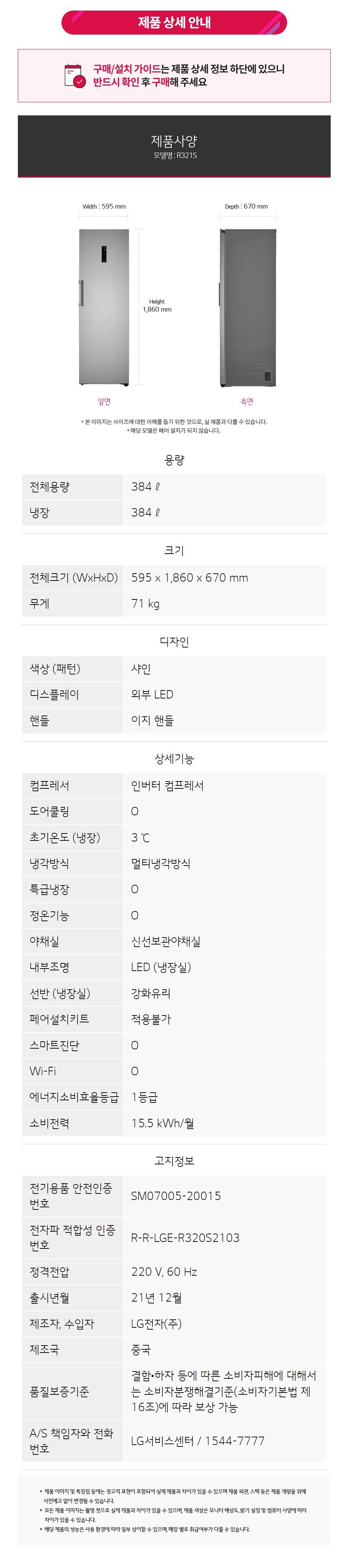 [LG전자] 컨버터블 패키지 전용냉장고 1도어 384L [샤인/R321S]