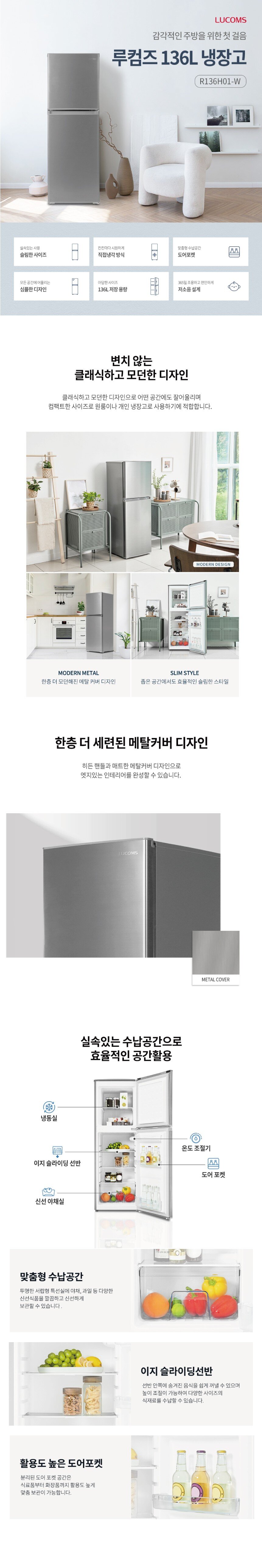 [루컴즈전자] 루컴즈 136L 저소음 2도어 슬림형 메탈릭 미니 냉장고 R136H01-W 설치배송