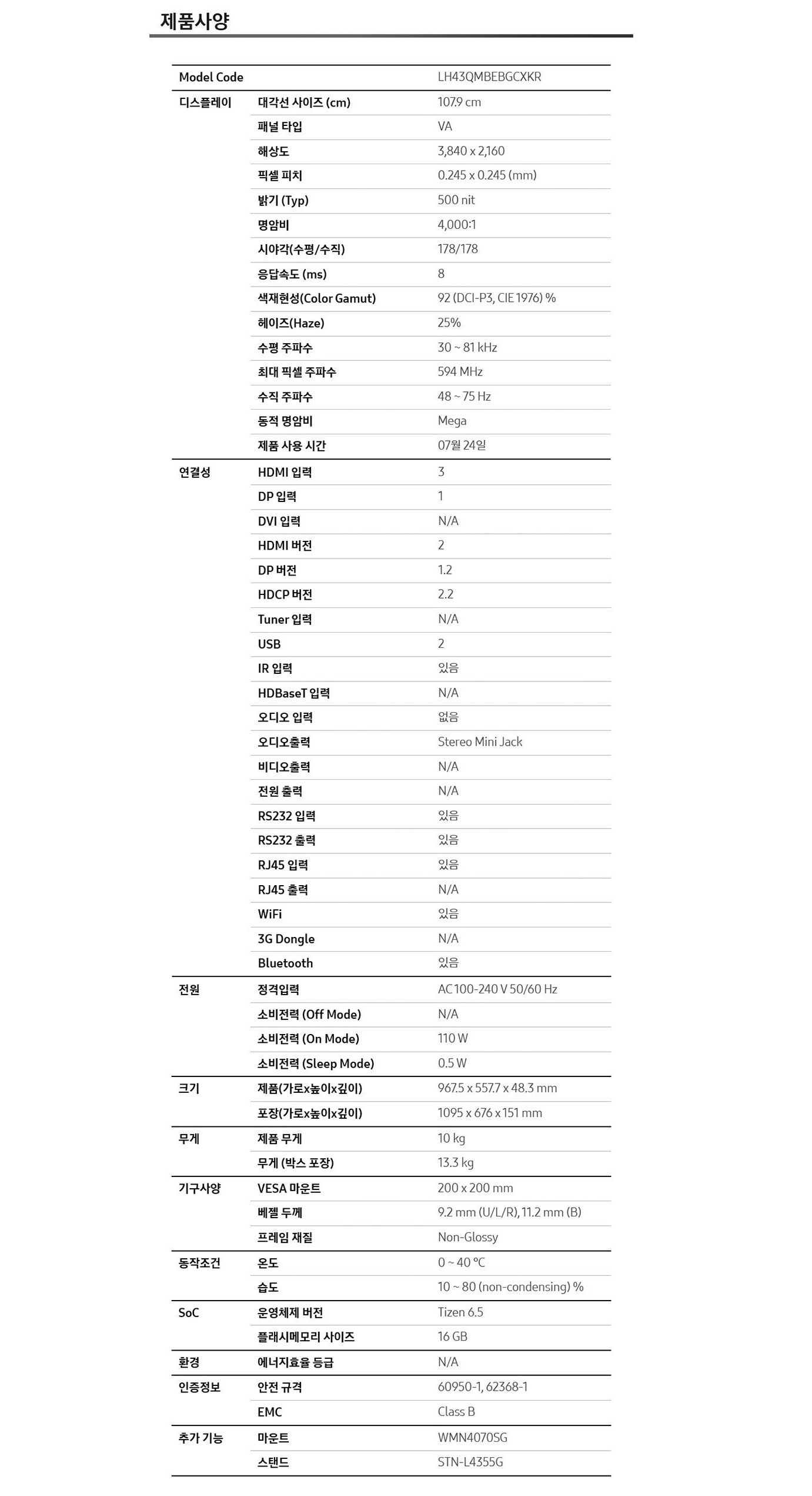 [삼성전자] 4K UHD 43인치 사이니지 TV 모니터 LH43QMBEBGCXKR 가로 벽걸이형