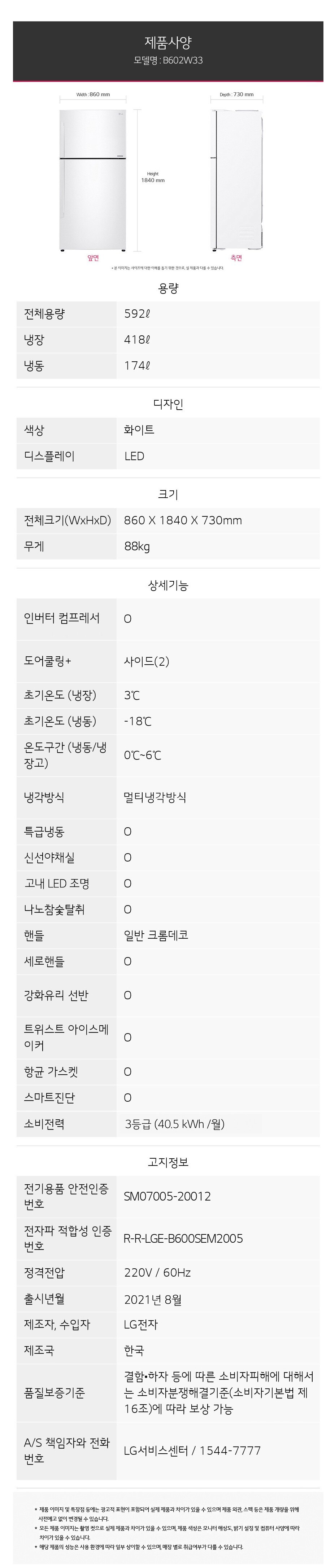 [LG전자] 일반냉장고 2도어 592L [화이트/B602W33]