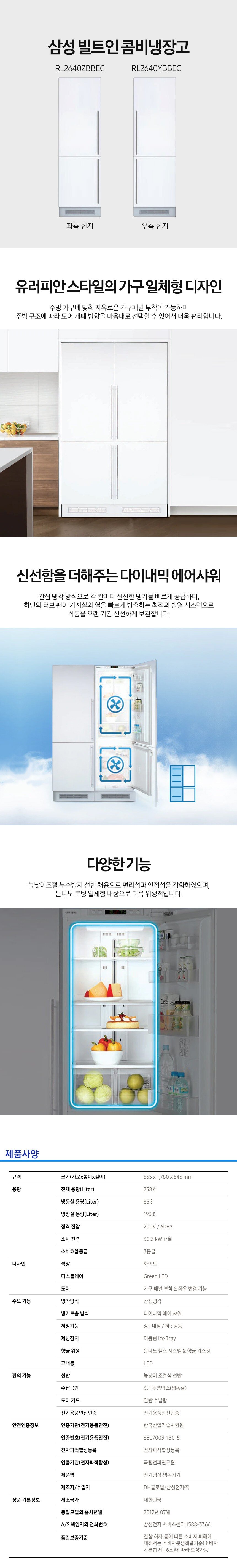 [삼성전자] 삼성전자 RL2290YBBEC 빌트인 일반형 콤비 냉장고 232L
