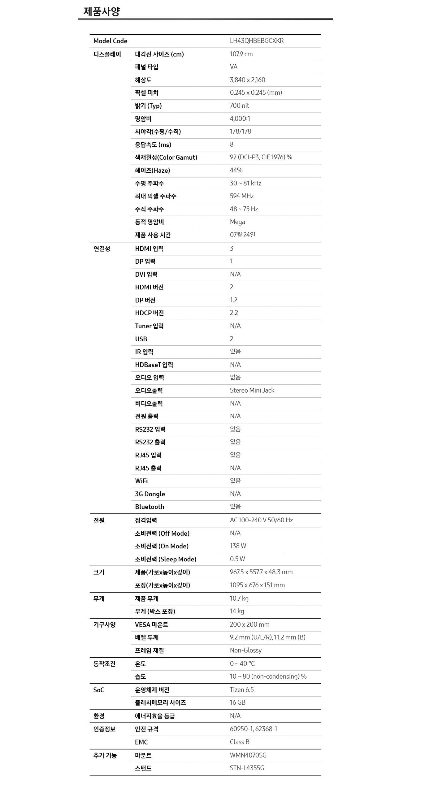 [삼성전자] 4K UHD 43인치 사이니지 TV 모니터 LH43QHBEBGCXKR 본체