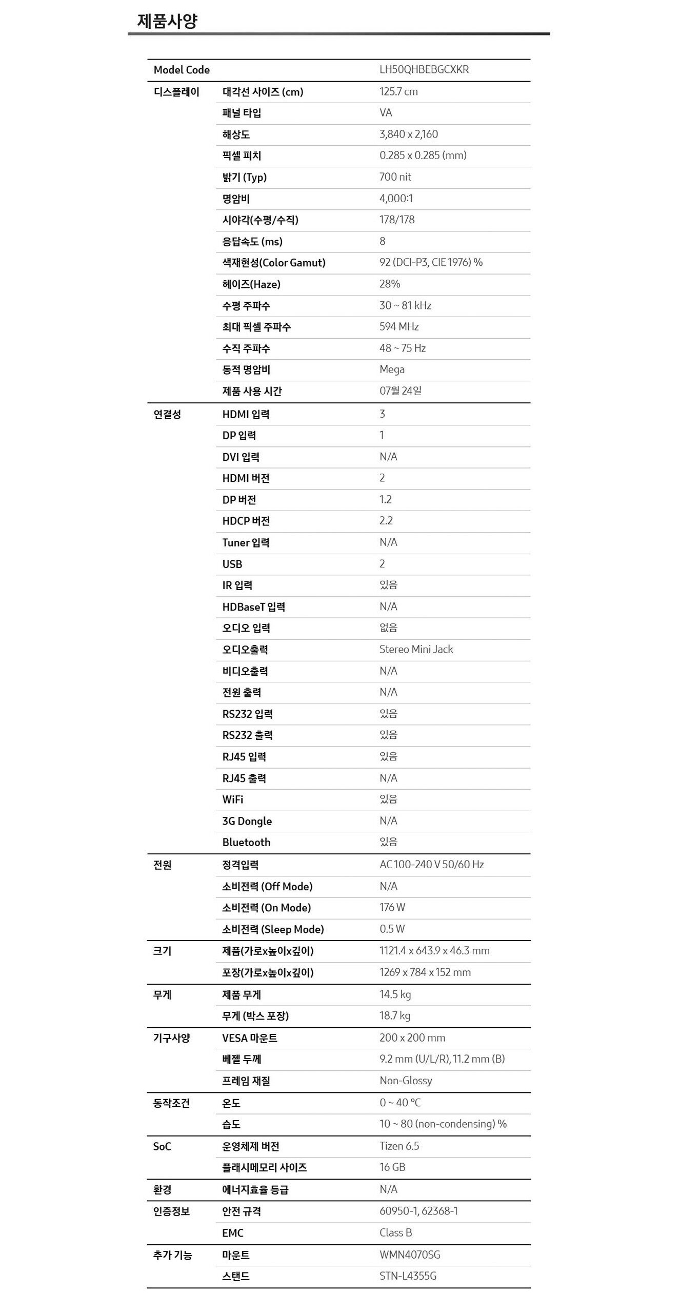 [삼성전자] 4K UHD 51인치 사이니지 TV 모니터 LH51QHBEBGCXKR 가로 벽걸이형