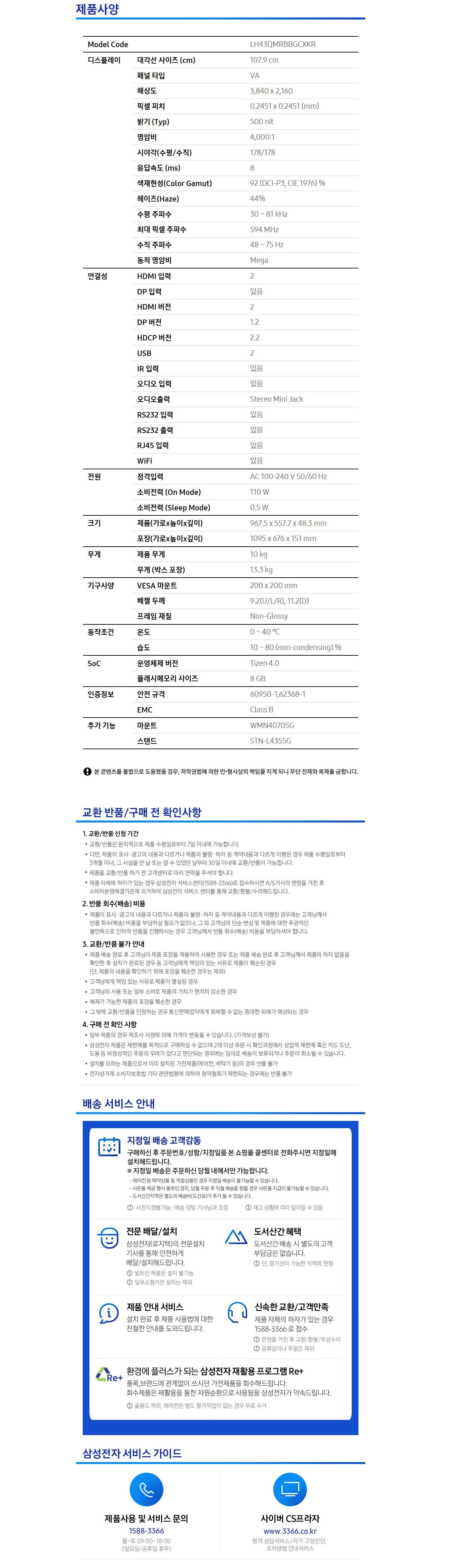 [삼성전자] 4K UHD 43인치 사이니지 IPTV 모니터 LH43QMRBBGCXKR 본체