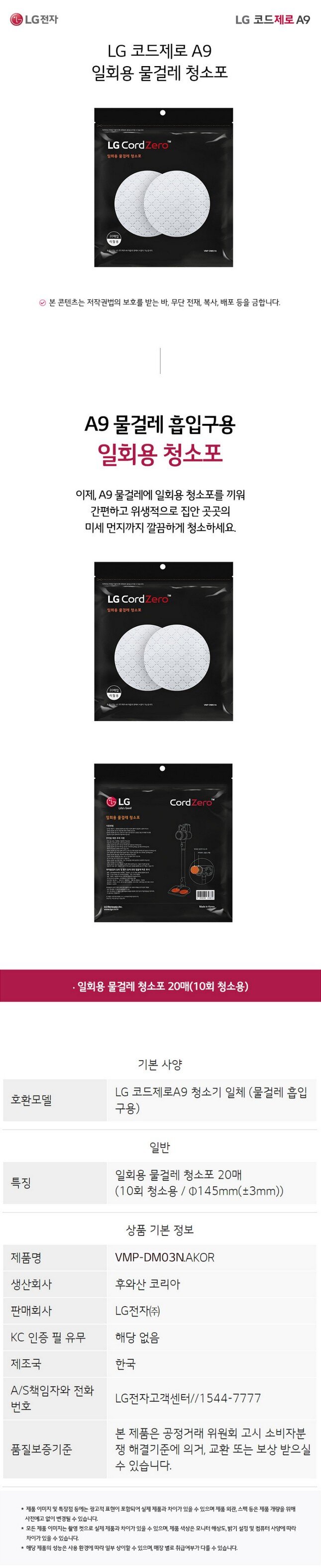 [LG전자] 코드제로 A9/A9S호환 물걸레 청소포 VMP-DM03N [일회용 청소포 20매/부착패드없음]