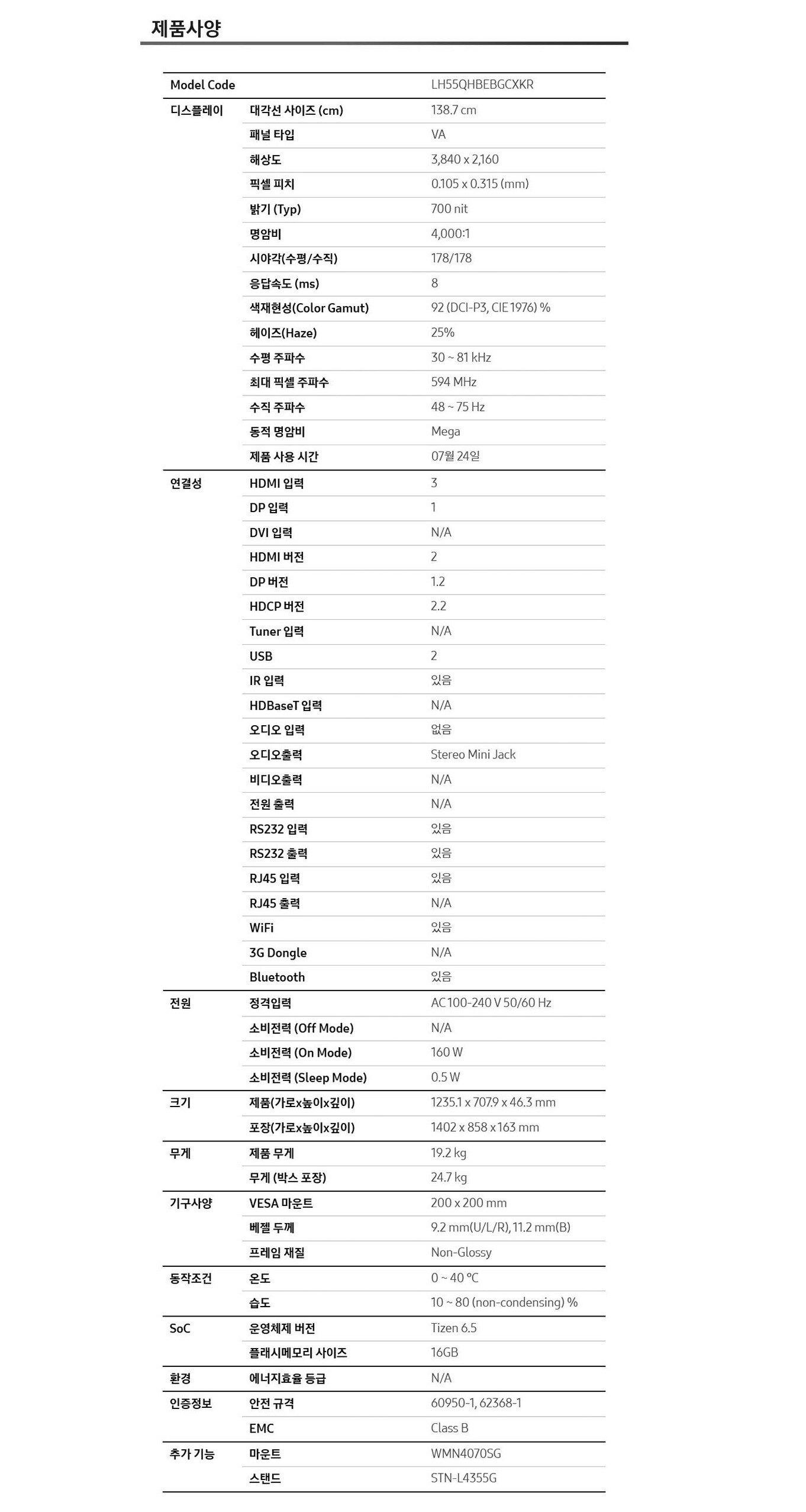 [삼성전자] 4K UHD 55인치 사이니지 TV 모니터 LH55QHBEBGCXKR 스탠드형